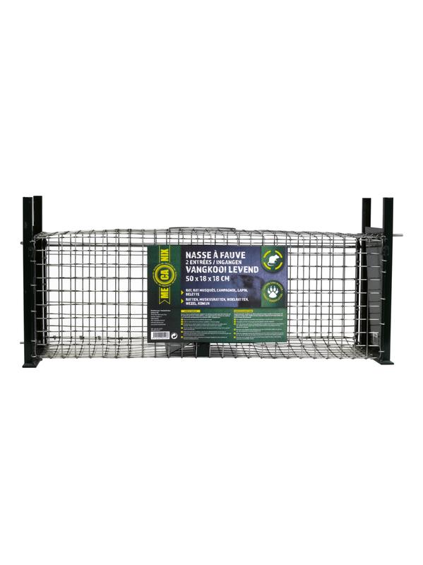 Gegalvaniseerde vangkooi om ratten, muskusratten, woelratten, eekhoorns, wezels, konijnen etc levend te vangen zonder ze kwetsen. De vangkans is hoger door middel van de 2 ingangen . 50x18x18cm